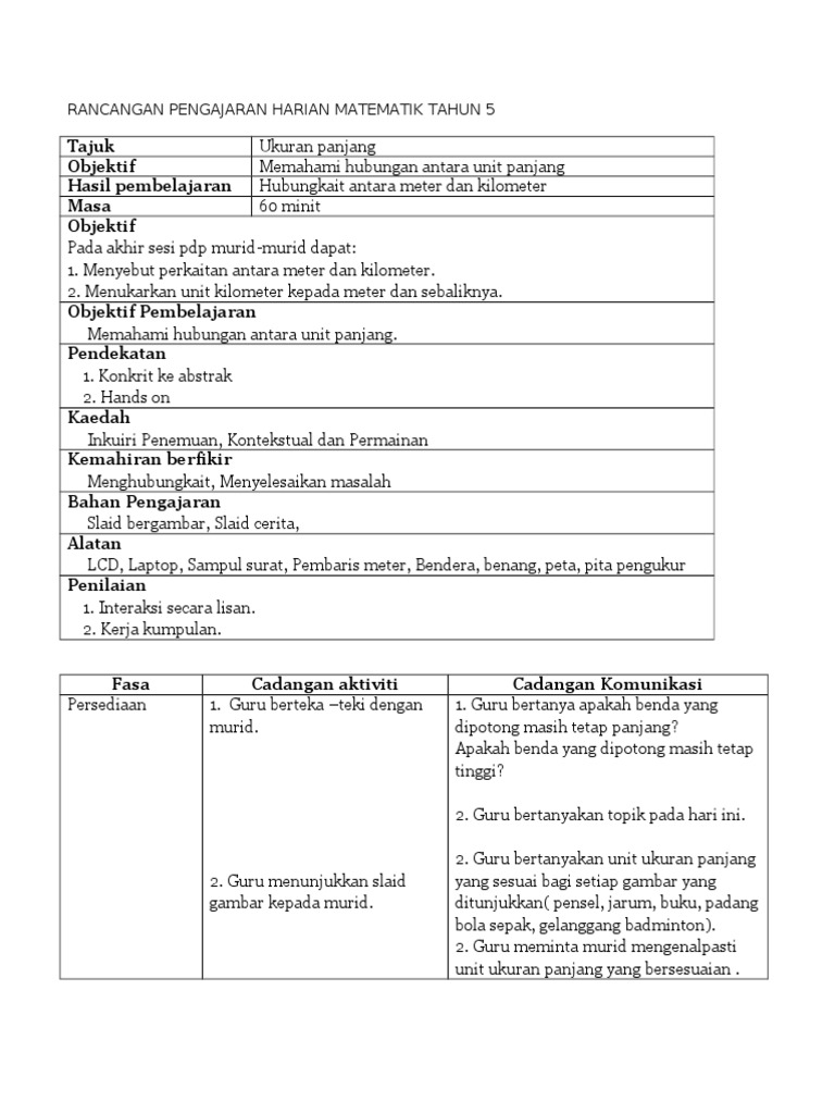 Rancangan Pengajaran Harian Matematik Tahun 5 Pdf